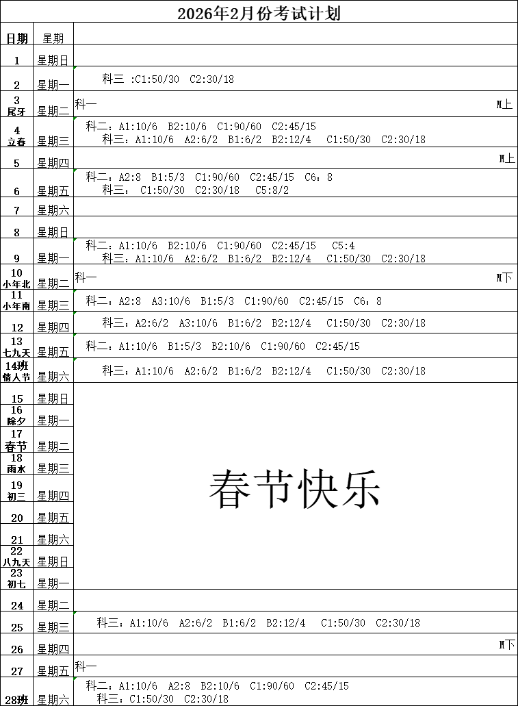 2026年02月份考试计划