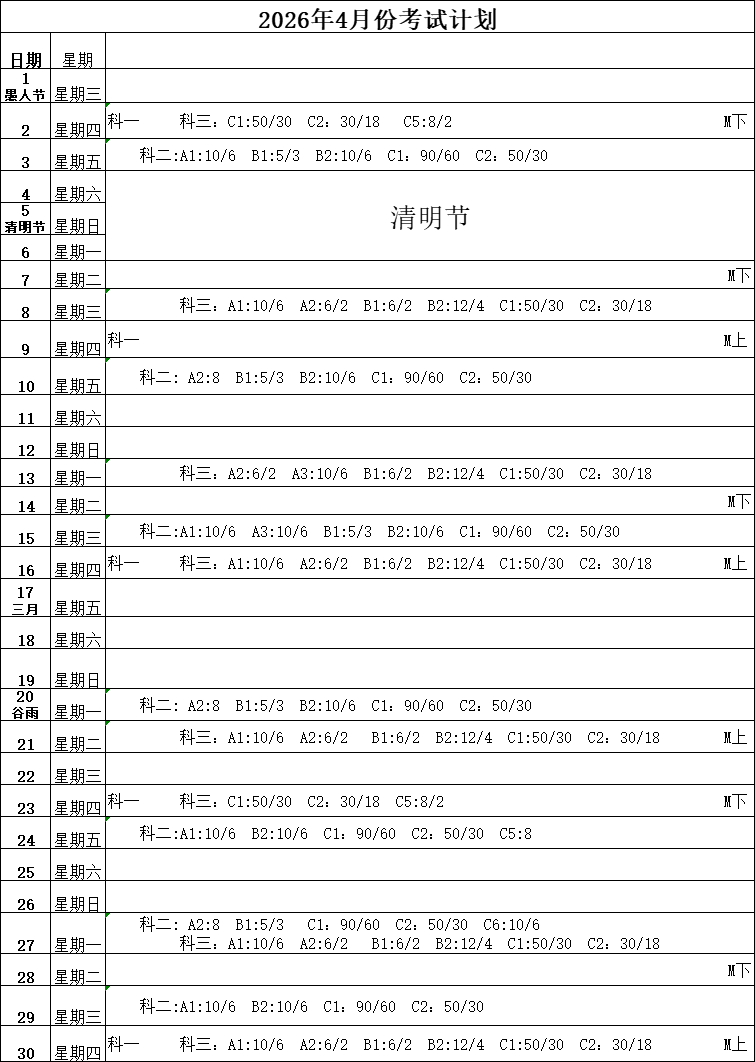 2026年04月份考试计划